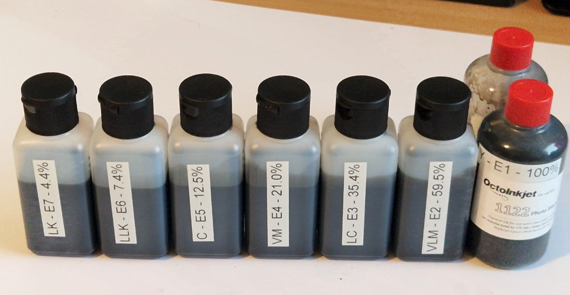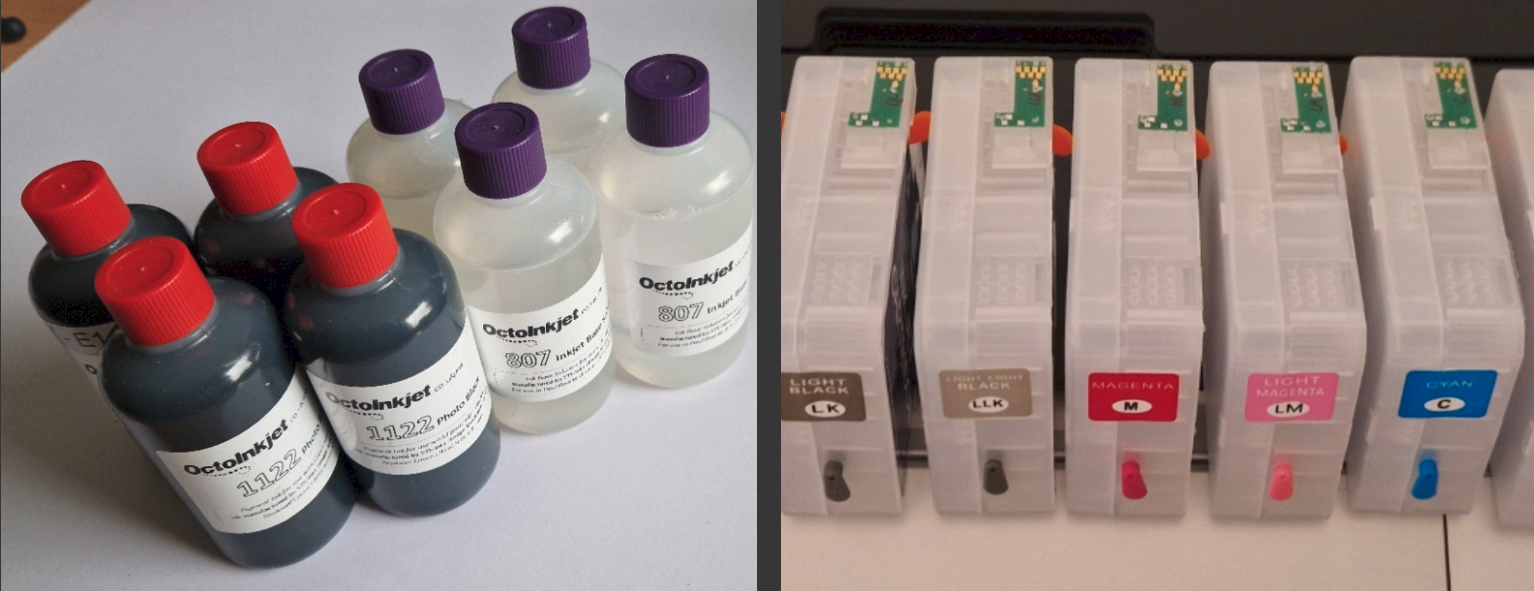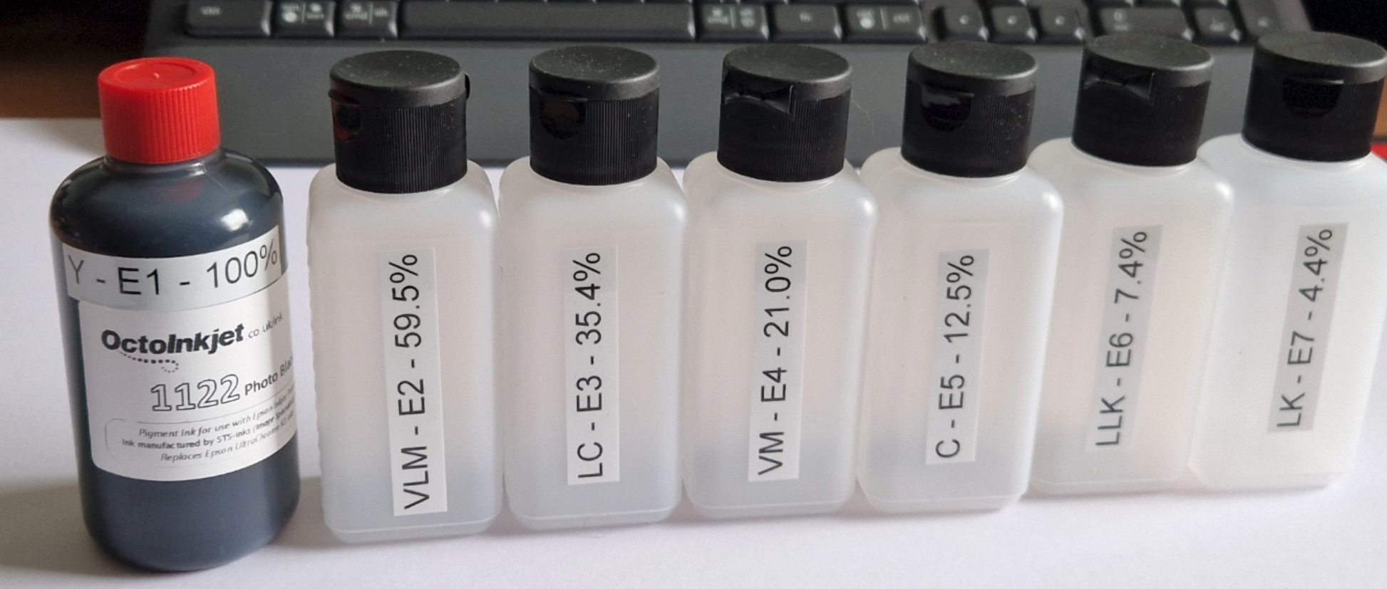 I was able to source Eboni pigment in 125ml bottles, within the UK, from Martin at OctoInkjet, along with the Base fluid with which to create my dilutions, and the refillable cartridges to fit my Epson R3880.