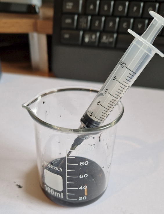 After laying out my mixing desk to prevent errors or spillages, I carefully prepared each dilution, measuring the smaller volume of pigment as accurately as possible with the syringe, then topping up to 70ml with the larger volume of base. For the 59.5%, I measured the smaller volume of base then topped up with pigment.