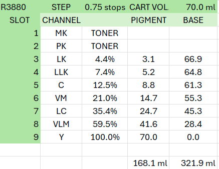 My R3880 cartridges take 70ml of mixed pigment each, so after plugging this value into my excel table, I worked out the volume of pigment and base for each mix: