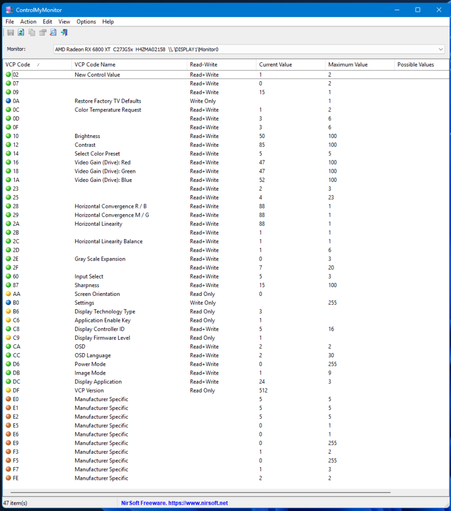The next question is whether my Samsung panels actually support it. Many monitors claim DDC/CI compatibility but only expose a handful of controls, or worse, expose them inconsistently across inputs. To find out, I turn to a tiny NirSoft utility called ControlMyMonitor. It enumerates every VCP (Virtual Control Panel) code a monitor reports, shows the current value, the allowed range, and whether the monitor accepts writes.